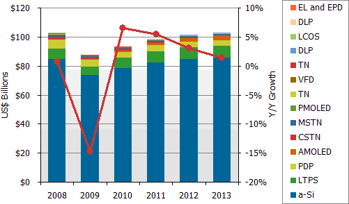 圖一 : 2008-2013全球平面顯示器按不同技術(shù)別出貨金額預(yù)估與年成長率(單位:百萬美金)