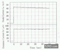 圖7是BSD電子源的emission電流時間變化特性圖,橫軸為時間,縱軸為電流密度,二極體電壓為16V,如圖所示二極體電流IPS與釋放電流Ie,不會隨著電流發(fā)生spike,亦即所謂的閃爍(flicker)現(xiàn)象,顯示BSD電子源不需外部電路,就可獲得傳統(tǒng)Spendtype電子源無法達(dá)成的特性。