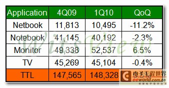 在小筆電和筆記本電腦面板方面,受到淡季的影響,出貨量分別下滑11.2%及2.3%。第二,液晶監(jiān)視器面板部分,面對液晶電視產(chǎn)能優(yōu)先的夾擊,供應(yīng)吃緊,故價格一路上揚至3月份,帶動出貨季成長6.5%,也為促成本季整體出貨成長的主力產(chǎn)品。第三,在液晶電視方面,受惠于中國新年的備貨,出貨量和上季幾乎持平,僅小幅減少0.4%。