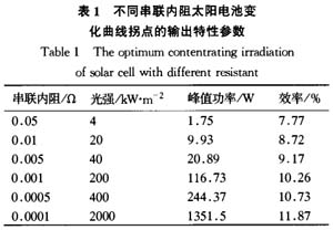 1)在特定的串聯(lián)內(nèi)阻下,太陽電他的峰值功率首先隨光強(qiáng)的升高而直線升高,升高到一定程度后曲線曲線變得平緩。曲線的拐點(diǎn)隨串聯(lián)內(nèi)阻的降低而升高。一般常規(guī)電池只能工作在幾個(gè)到20個(gè)太陽之間,能夠得到較好的收益。若想進(jìn)一步提高光強(qiáng),必須采用小串聯(lián)內(nèi)阻的太陽電池。