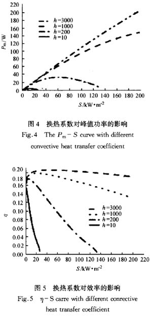 太陽光照射到太陽電池上,一部分轉(zhuǎn)變?yōu)殡?,而大部分卻轉(zhuǎn)變?yōu)闊幔固栯姵販囟壬?,從而影響太陽電池的性能。在同樣條件下,不同的冷卻方式和工況,太陽電池的工作溫度也不同,也就是電池的性能也不同。而冷卻方式和工況的不同主要表現(xiàn)為換熱系數(shù)的不同。圖4—圖6給出了換熱系數(shù)對(duì)系統(tǒng)性能的影響規(guī)律。從圖中可以看出,換熱系數(shù)越高,系統(tǒng)的性能越好,而且隨著光強(qiáng)的升高,換熱系數(shù)的影響越來越顯著。