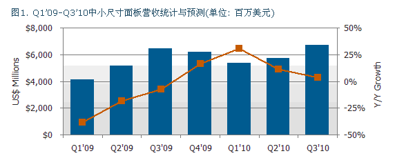 全球中小尺寸面板的出貨在2010年第二季持續(xù)攀升,營收數(shù)字達(dá)到五十四億美元,比去年同期成長百分之三十一。根據(jù)最新的Quarterly Small/Medium Shipment and Forecast Report指出, 這個市場區(qū)隔預(yù)計持續(xù)成長,而在2010年第三季的全球營收數(shù)字將會達(dá)到六十七億美元。