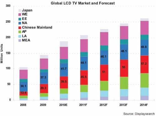 2010年全球MOCVD新增安裝量中,由于受到LED背光在LCD TV滲透的加快帶動下, LCD TV制造強國的韓國增量最多,其次是臺灣地區(qū)。根據(jù)SEMI統(tǒng)計,中國大陸今年MOCVD新增量大概在177臺,出貨量居全球第三。另外,根據(jù)SEMI統(tǒng)計和分析,結(jié)合MOCVD供應(yīng)情況,2011年中國MOCVD新增量份額有望達(dá)到全球的40%,而其它地區(qū)的增量會保持與2010年相當(dāng)?shù)乃交蛳陆怠?