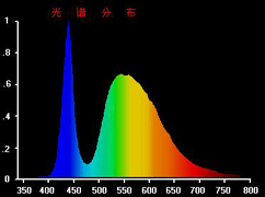 LED的光譜特性參數(shù)主要包括峰值發(fā)射波長(zhǎng)、光譜輻射帶寬和光譜功率分布等。單色LED的光譜為單一波峰,特性以峰值波長(zhǎng)和帶寬表示,而白光LED的光譜由多種單色光譜合成。所有LED的光譜特性都可由光譜功率分布表示,白光LED光譜功率分布如圖6所示。而由LED的光譜功率分布還可計(jì)算得到色度參數(shù)。
