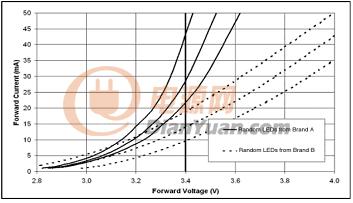 很明顯,假如用恒壓電源3.4V供電,顯然流過每個(gè)LED的電流都不一樣,每個(gè)LED的亮度也就不一樣。所以不能采用恒壓電源供電。