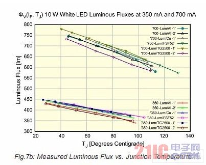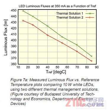 在圖7a中顯示了兩個同一廠商的兩個白色LED光通量和參考溫度的關(guān)系,這兩個LED具有不同的散熱方式。散熱方式1使用了一塊金屬的PCB板,而散熱方式2使用了傳統(tǒng)的FR4板。此外,兩個LED樣品的PCB板和散熱器之間使用了不同的導(dǎo)熱界面材料。