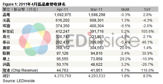 集邦科技(TRENDFORCE)旗下研究部門LEDinside統(tǒng)計, 2011年4月臺灣上市上柜LED廠商營收總額約96.2億元,(MoM+3.39%,YoY+6.6%)。從上游芯片廠營收來看,2011年四月份臺灣地區(qū)上市柜LED芯片/晶粒廠營收43.7億元,與去年同期相比,成長8.5%,(MoM+1.8%; YoY+8.5%)。下游LED封裝方面,四月份臺灣地區(qū)上市柜LED封裝廠營收達(dá)到52.5億元,與去年同期相比,成長5% (MoM+2.9%,YoY+5%)。整體表現(xiàn),LED背光源市場穩(wěn)定拉貨,四月營收持平成長。