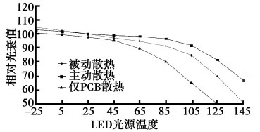 圖4是LED光源溫度與光衰在不同的散熱方式下的關(guān)系曲線。圖中可見僅PCB散熱、加散熱器的被動散熱和強制對流的主動散熱3種不同散熱設(shè)計存在相當(dāng)大的差異。后二種在105℃時,基本上能夠提供80%以上的出光率。