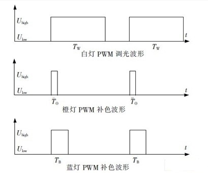 圖2 白燈及補(bǔ)色彩燈的PWM 調(diào)光波形圖。