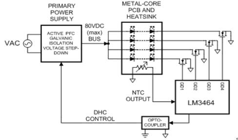 此外,本文還將給出另外一種實(shí)現(xiàn)方法的結(jié)構(gòu)示意圖,即采用隔離式AC/DC電源及一款具有動(dòng)態(tài)余量控制的LM3464。通過避免電磁干擾,該方案具有極高效率。