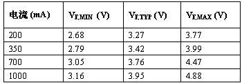 表 1:大電流白光 LED 的正向壓降與驅(qū)動電流。