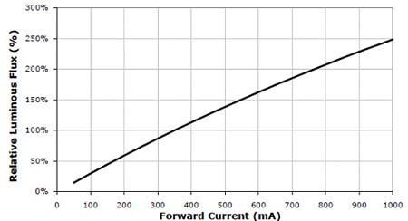圖1. XLampXP-G的輸出相對光強(qiáng)和正向電流的關(guān)系