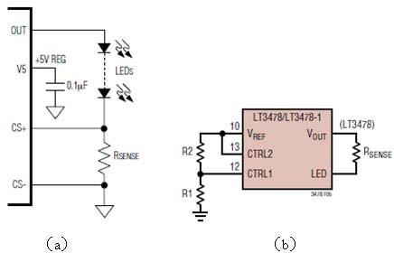調(diào)節(jié)LED的電流最簡單的方法就是改變和LED負(fù)載串聯(lián)的電流檢測電阻(圖2a),幾乎所有DC-DC恒流芯片都有一個檢測電流的接口,是檢測到的電壓和芯片內(nèi)部的參考電壓比較,來控制電流的恒定。但是這個檢測電阻的值通常很小,只有零點(diǎn)幾歐,如果要在墻上裝一個零點(diǎn)幾歐的電位器來調(diào)節(jié)電流是不大可能的,因?yàn)橐€電阻也會有零點(diǎn)幾歐了。所以有些芯片提供一個控制電壓接口,改變輸入的控制電壓就可以改變其輸出恒流值。例如凌特公司的LT3478(圖2b)只要改變R1和R2的比值,也可以改變其輸出的恒流值。