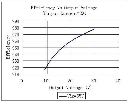 圖中的輸入電壓為35V,輸出電流為2A,當(dāng)輸出電壓為30V時,效率可以高達(dá)97.8%。但是當(dāng)輸出電壓降低到20V時,效率就降為96%;當(dāng)輸出電壓降低為10V時,效率就降低為92%。在這三種情況下,盡管其輸出功率依次為60W,40W和20W,但是其損耗功率卻依次為1.2W,1.6W,1.6W。后兩種情況下功耗增大了33%。假如恒流模塊的散熱系統(tǒng)設(shè)計(jì)得非常臨界,增加33%的耗散功率就有可能會使芯片的結(jié)溫升高,以致發(fā)生過溫保護(hù)而無法工作,嚴(yán)重時也有可能使芯片燒毀。