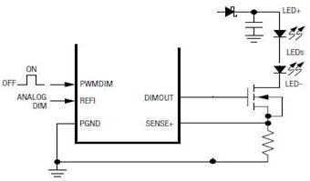 具體實(shí)現(xiàn)PWM調(diào)光的方法就是在LED的負(fù)載中串入一個MOS開關(guān)管(圖8),這串LED的陽極用一個恒流源供電。