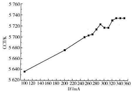 由圖4可知,當(dāng)正向電流為350mA時,色溫為5734K,而正向電流增加到350mA時,色溫就偏移到5636K。電流再進(jìn)一步減小時,色溫會向暖色變化。