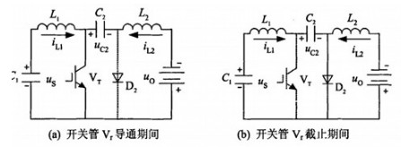 此期間開關(guān)管Vr導(dǎo)通,電容C2上的電壓使二極管D2反偏而截止,這時(shí)輸入電流iL2使Ll儲(chǔ)能;C2的放電電流iL2使L2儲(chǔ)能,并供電給負(fù)載,如圖8(a)所示。