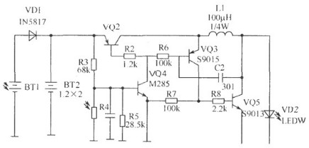 該電路的工作原理:白天有太陽光時(shí),由BT1把光能轉(zhuǎn)換為電能,由VD1對(duì)BT2充電,由于有光照,光敏電阻呈低阻,VQ4 b極為低電平而截止。當(dāng)晚上無光照時(shí)光敏電阻呈高阻,VQ4導(dǎo)通,VQ2 b極為低電平也導(dǎo)通,由VQ3、VQ5、C2、R6、L1組成的DC升壓電路工作,LED得電發(fā)光。