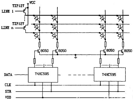 常規(guī)型驅(qū)動電路的設(shè)計一般是用串入并出的通用集成電路芯片如74HC595或MC14094 等作為列數(shù)據(jù)鎖存,以8050 等小功率NPN 三極管為列驅(qū)動,而以達(dá)林頓三極管TIP127等作為行掃描管,其電路如圖1 所示。
