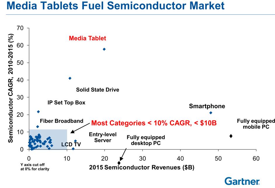 在這107項(xiàng)被調(diào)查的產(chǎn)品中,幾乎絕大多數(shù)在未來5年內(nèi)的半導(dǎo)體產(chǎn)值都在100億美元以內(nèi)(上圖左下角藍(lán)色部份)。而接下來的幾年,扮演推動半導(dǎo)體成長重任的產(chǎn)品,將從PC轉(zhuǎn)移到平板計(jì)算機(jī)、智慧手機(jī)和固態(tài)硬盤(SSD)身上。