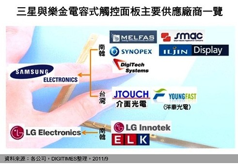 DIGITIMES Research 分析,相較于樂金主要向韓廠LG Innotek與ELK (Electro Luminescence Korea)采購觸控面板,三星不僅向Melfas、SMAC (Smart Mobile Application Company)、Synopex、Iljin Display、Digitech Systems、Moreens等韓廠采購,亦向日廠、臺廠與大陸業(yè)者采購觸控面板,可知三星于觸控面板采購多角化發(fā)展較樂金顯著。