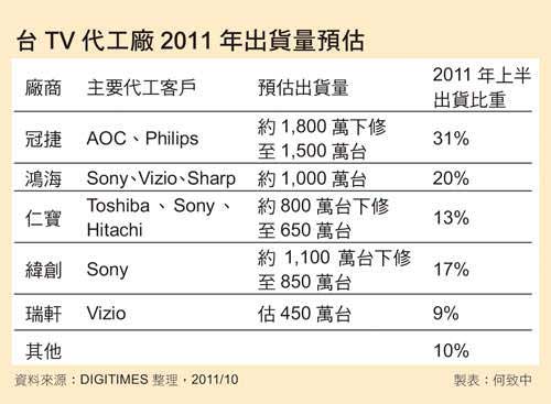 液晶電視制造龍頭冠捷雖握有自有品牌AOC與飛利浦(Philips)品牌訂單,但亦因整體市場需求不佳,下調(diào)2011年出貨量,從原先1,800萬臺(tái)下修至約1,500萬臺(tái);緯創(chuàng)第3季表現(xiàn)雖相對(duì)較佳,出貨量仍逐月成長,一路從55萬臺(tái)爬升至80萬臺(tái),然近期亦將全年液晶電視出貨量從1,100萬臺(tái)下修至約850萬臺(tái);至于手握Sony液晶電視訂單的鴻海,2011年也面臨出貨量下修窘境。
