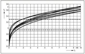 即使是同一型號的LED其伏安特性在各個個別的器件之間也是不同的,更何況在不同生產廠家之間就更是不同了(圖8)。