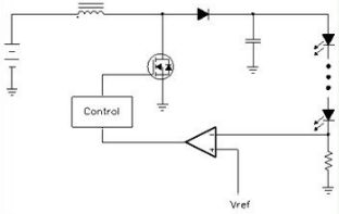 圖中顯示了一個基本的電感升壓電路,其中控制器(Control)給出了一個PWM開關信號來控制大功率開關管,后者在導通時對電感充電,而在斷開時電感中的能量就對電容充電。經過幾次開關以后就可以把輸入電壓泵至更高的電壓,從而完成升壓的任務。改變PWM信號的工作比就可以改變其輸出電壓。為了保持輸出電流的恒定,就要求測量輸出電流值,這是靠一個和LED串聯(lián)的小電阻來測量的。這個電阻上的電壓就和一個參考電壓相比較,比較所得出的誤差信號就送去控制器用以改變PWM信號的工作比,這樣就實現(xiàn)了一個閉環(huán)自動控制,以控制其輸出電流為恒定。