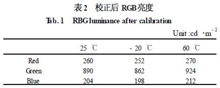 表1 中,常溫的白場配色比例為1. 92 ∶6. 57 ∶1. 51。而當溫度發(fā)生變化時,由于LED 的特性,使RGB 的亮度特性發(fā)生了嚴重的偏移,使白場的比例已完全偏離了常溫下的比例,使圖像在色彩發(fā)生了畸變。而采用本文的校正技術后,結果如表2 所示。