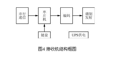 發(fā)射機(jī)由單片機(jī)、鍵盤(pán)、編碼器、發(fā)射器、串行通信接口和UPS供電系統(tǒng)組成,其結(jié)構(gòu)框圖如圖3所示。