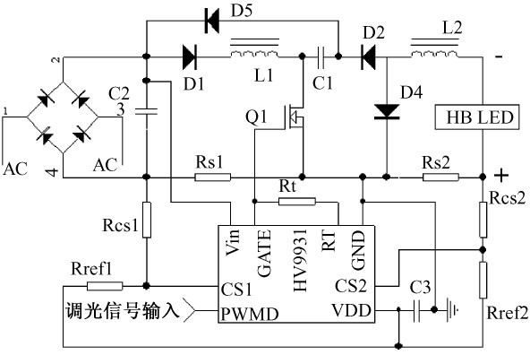 電路工作于峰值電流模式下, 振蕩器使GATE輸出高電平, 使Q1 通導(dǎo)通; CS1 和CS2 端子分別是HV9931 內(nèi)部的兩個(gè)電壓比較器的反向輸入端,兩個(gè)比較器的同向輸入端在芯片內(nèi)部接地,電路通過CS1 和CS2 端子同時(shí)檢測(cè)輸入電流和輸出電流,CS1 是輸入電流信號(hào)檢測(cè)端子,CS2 輸出電流信號(hào)檢測(cè)端子,這兩個(gè)端子只要有一個(gè)端子上的電壓比地低,GATE 端子就輸出低電平,Q1 就關(guān)斷。VDD是芯片的基準(zhǔn)電壓輸出引腳,Rs1、Rcs1 和Rref1 可編程設(shè)定L1 中的最大峰值電流, Rs2、Rcs2 和Rref2 可編程設(shè)定輸出電流。在交流電的周期內(nèi)可認(rèn)為占空比和開關(guān)頻不變,故輸入電流峰值包絡(luò)線為正弦波,平均電流為正弦波,可實(shí)瑞功率因數(shù)校正。
