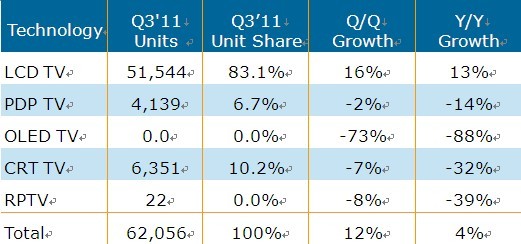 全球液晶電視出貨增幅比預(yù)期高出1%,年成長(zhǎng)率達(dá)12.9%,出貨量為5千150萬臺(tái)。相較于第一季和第二季均僅為個(gè)位數(shù)成長(zhǎng),這表明終端市場(chǎng)需求正在提高。部分尺寸的液晶電視價(jià)格要低于一般價(jià)格水平,如32寸為300美金,40-42寸為500美金。液晶電視背光持續(xù)向LED轉(zhuǎn)移,但轉(zhuǎn)移速率比預(yù)期要低。LED背光模式占全部液晶電視出貨量的48%,其中大部分為側(cè)光式。120Hz及以上掃描頻率的電視出貨比率沒有大的改變,第三季度占液晶電視出貨量的22%。第三季3D電視的占比從第二季的9%上升到11%。具備高端性能3D與LED背光電視出貨成長(zhǎng)較預(yù)期緩慢,表明消費(fèi)者花錢仍然保守,也不愿意花更多的錢購買高性能電視。