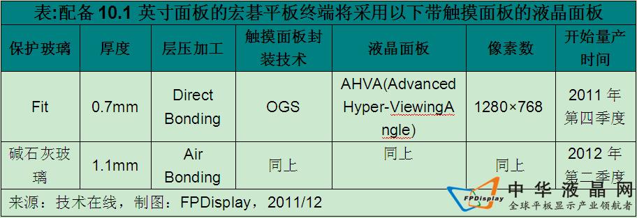 估計友達光電的月生產(chǎn)規(guī)模為1.5萬~1.8萬塊,成品率超過五成。厚度會比不采用OGS技術(shù)的產(chǎn)品減小3成。采用的玻璃為美國康寧稱為“Fit”的化學(xué)強化玻璃,F(xiàn)it雖不如“Gorilla”玻璃堅固,但十分易于加工。宏?目前正考慮采用基于更易加工的堿石灰玻璃的液晶面板(下表)。