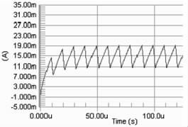 要保證PWM 周期小于電感的τ 時間, 因?yàn)槿鬚WM 的周期大于τ, 則極有可能出現(xiàn)在PWM 的占空比變化的情況下, 電路中電流都能達(dá)到電感的飽和直流電流, 影響了對LED 電流調(diào)節(jié)。當(dāng)C8051330 的時鐘頻率是25 MHz ,PWM 的周期的選擇對電流改變檔位的影響很大。若周期越大, 則PWM 占空比的檔位越多, 反之越少。擬用256 個檔位的占空比, 因此PWM 波的頻率應(yīng)選擇在100kHz 以下,即周期在10 μs 以上,直流電感為10Ω, 此時電感值應(yīng)選擇大于0.1 mH.圖2 分別是PWM 頻率為100kHz , 占空比為90%, 電感為0.1 mH、1 mH 和40 mH 時電路電流值的模擬結(jié)果。