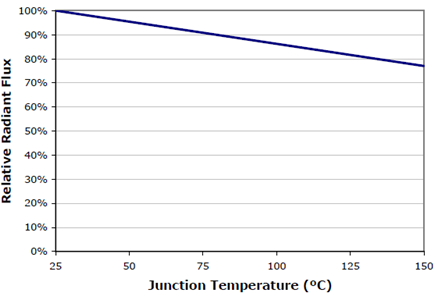 圖3. XLamp7090XR-E的相對光輸出隨結溫的升高而降低