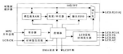 LCD控制模塊的數(shù)據(jù)通道由調(diào)色板RAM、灰度/串行器和輸出FIFO這3個部分組成。這3個部分支持12或16位STN方式,由控制器控制輸出數(shù)據(jù)到LCD的數(shù)據(jù)總線上。而對于16位薄膜工藝學(xué)(TFT,Thin ̄Film Technology)方式,數(shù)據(jù)直接傳輸?shù)絃CD的總線,提供2(16)=64K的彩色信號。