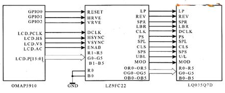 LZ9FC22和OMAP5910的LCD控制器連接,由于LZ9FC22是18位控制器(RGB信號各有6位),而OMAP5910的LCD控制器的輸出只有16位數(shù)據(jù),為此必須損失兩位數(shù)據(jù),將LZ9FC22的R0和BO接地,或者將R0和R5、BO和B5連接在一起。