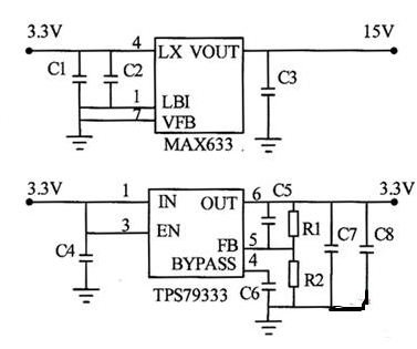 LQ035Q7D面板顯示需要15V的高壓,而LQ035Q7D的邏輯電平需要3.3V電源。圖3實現(xiàn)從3.3V轉(zhuǎn)換到15V和3.3V的電源原理。其中3.3V到3.3V使用TI公司的TPS79333,是為了保證輸出到LCD的3.3V穩(wěn)定可靠,如果TPS79333的輸入3.3V足夠穩(wěn)定,滿足LQ035Q7D的要求,也可以直接將該電源連接到LCD。