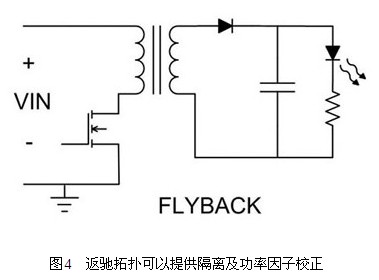 基于安全考慮,可能會(huì)規(guī)定在脫機(jī)電壓及輸出電壓之間進(jìn)行隔離。此應(yīng)用方式下,最節(jié)省成本的解決方法就是使用返馳轉(zhuǎn)換器(圖4),在所有的隔離拓?fù)渲校@種作法所需要的組件數(shù)量最少。變壓器匝數(shù)比可用來對(duì)輸出電壓進(jìn)行降壓、升壓或降壓升壓,設(shè)計(jì)彈性很大,不過缺點(diǎn)在于電源變壓器基本上是訂制組件。此外,在FET以及輸入和輸出電容器中,也會(huì)有高組件應(yīng)力的情形出現(xiàn)。應(yīng)用固定燈光時(shí),可以使用「慢速」的回饋控制循環(huán),調(diào)節(jié)LED電流與輸入電壓同相位的情形,進(jìn)行功率因子校正(PFC)。這樣可以調(diào)節(jié)所需的平均LED電流,并能調(diào)節(jié)輸入電流與輸入電壓同相位的情形,以提供高功率因子。