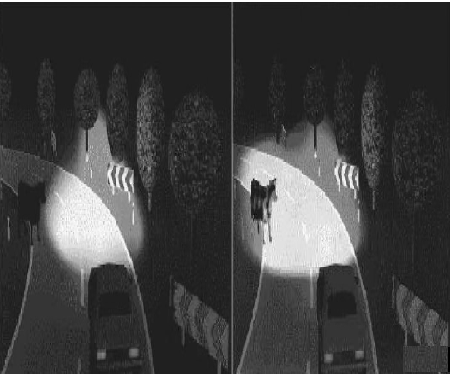 圖9 傳統(tǒng)前照燈( 左) 與AFS 前照燈( 右) 彎道盲點(diǎn)照明效果