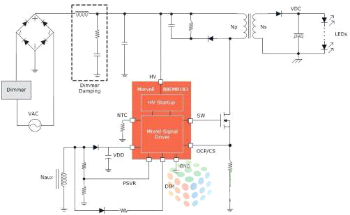 消費(fèi)者用LED節(jié)能燈取代白熾燈等傳統(tǒng)照明解決方案的同時(shí),也希望得到同樣或更好的照明體驗(yàn)。不幸的是,他們常常發(fā)現(xiàn)LED燈在調(diào)光能力上有問(wèn)題,因此覺(jué)得LED燈幾乎不能調(diào)光或調(diào)光時(shí)會(huì)閃爍。很多LED燈與家中已安裝的壁式調(diào)光器也不兼容。Marvell最新的88EM8183深度調(diào)光單級(jí)交流/直流 LED驅(qū)動(dòng)器IC為OEM廠商和ODM廠商提供了兼容性最廣泛的調(diào)光解決方案,該IC與全球市場(chǎng)上絕大多數(shù)調(diào)光器都兼容,而且提供卓越的光輸出質(zhì)量,可提高消費(fèi)者的滿意度,減少退貨。