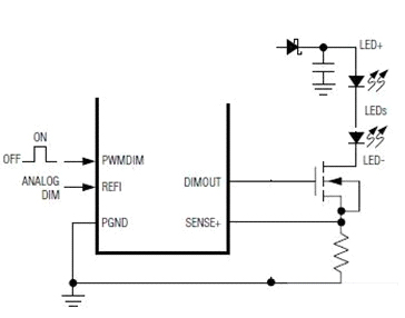 然后用一個(gè)PWM信號(hào)加到MOS管的柵極,以快速地開關(guān)這串LED。從而實(shí)現(xiàn)調(diào)光。也有不少恒流芯片本身就帶一個(gè)PWM的接口,可以直接接受PWM信號(hào),再輸出控制MOS開關(guān)管。