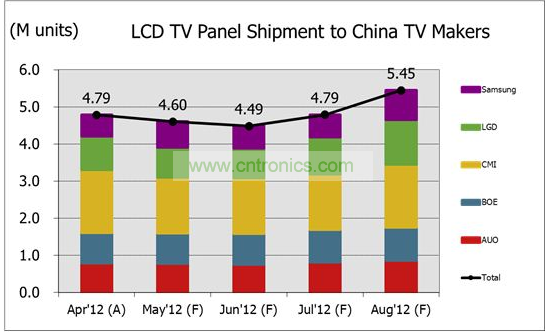 圖一、2012年4-8月出貨至中國本土廠商電視面板按供貨商數(shù)量走勢