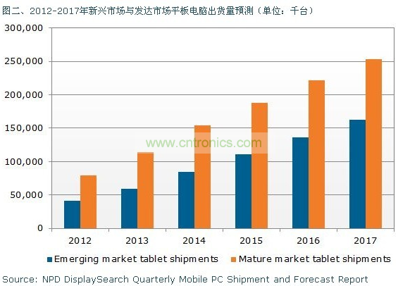 筆記本電腦出貨量預(yù)計(jì)從2012年的2億800萬臺(tái)增長到2017年的3億9千300萬臺(tái),而平板電腦出貨量預(yù)計(jì)將同期從1億2千100萬臺(tái)增長到4億1千600萬臺(tái),年復(fù)合增長率將達(dá)28%。平板電腦成長的主要?jiǎng)恿碜杂谠诎l(fā)達(dá)市場的應(yīng)用增長(包括北美、日本和西歐),2012年該市場平板電腦的出貨占比為66%,并且在整個(gè)預(yù)測期內(nèi)占比也將保持在60%左右。平板電腦在發(fā)達(dá)市場的出貨量預(yù)計(jì)將從2012的8千萬臺(tái)增長到2017年的2億5千400萬臺(tái)。