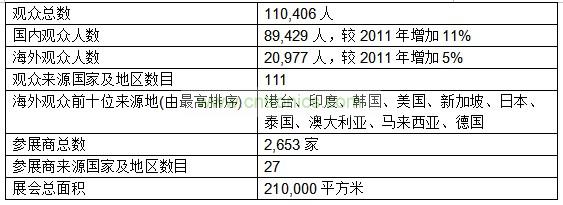 第十七屆「廣州國際照明展覽會」展覽面積達(dá)21萬平方米,規(guī)模較2011年增長5%,參展企業(yè)2653家,比上屆減少9%,參展企業(yè)來自全球27個國家和地區(qū)。本屆展會觀眾數(shù)目同創(chuàng)新高,吸引了110,406名觀眾,較2011年增長10%,分別來自111個國家及地區(qū),其中國內(nèi)專業(yè)觀眾89,429人,較2011年增加11%,海外專業(yè)觀眾20,977人,較2011年增加5%,海外觀眾前十位來源地分別是港澳臺地區(qū)、印度、韓國、美國、新加坡、日本、泰國、澳大利亞、馬來西亞和德國。大會同期舉辦的各類技術(shù)研討會、產(chǎn)業(yè)高峰論壇、產(chǎn)品推介會、交易節(jié)等高水平會議、論壇交流活動多達(dá)110多場次,較去年增加10場,亦創(chuàng)新高。