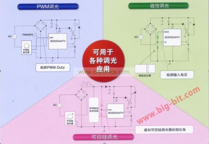 其主要特點是:可進行可控硅/PWM/線性調(diào)光。適用于各種調(diào)光應(yīng)用(調(diào)光比0.2%-100%);內(nèi)置緩沖功能,照度變化平穩(wěn)(可選擇有緩沖、無緩沖);通過LED平均電流控制,可針對輸入電壓、輸入電壓變化,控制相應(yīng)的LED電流。這種對應(yīng)可控硅調(diào)光的LED照明用驅(qū)動IC可用于兼容調(diào)光器的燈泡型LED照明、兼容調(diào)光器的LED筒燈照明和兼容調(diào)光器的LED基礎(chǔ)照明。