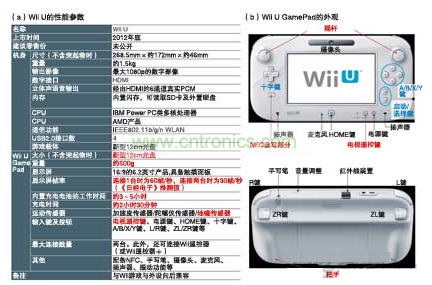 在E3上公開了Wii U的具體性能參數(shù)。例如,判明了平板型控制器“Wii U GamePad”的尺寸、重量及各種按鈕的配置等。另外,(b)的紅字部分指新追加或者大幅變更的部材,藍字部分指配置位置有很大變化的部材。