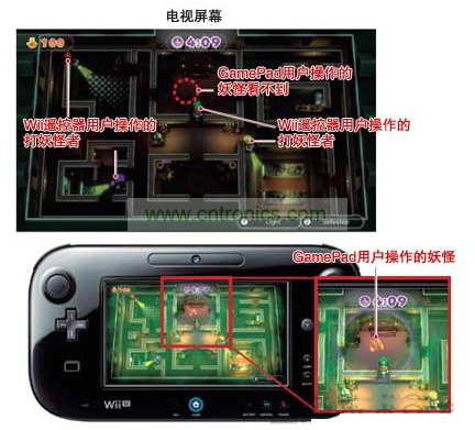 在Wii U上,只有使用GamePad的用戶,才能在看著與電視上顯示內(nèi)容不同的信息玩游戲。比如,在打妖怪的迷你游戲“Luigi’s Ghost Mansion”中,手拿GamePad的用戶操作妖怪,手拿Wii遙控器的4名用戶負責(zé)打退妖怪。此時,手拿GamePad的用戶可在該屏幕上看到負責(zé)打妖怪的卡通人物的位置,而打妖怪的人卻看不到妖怪的位置。