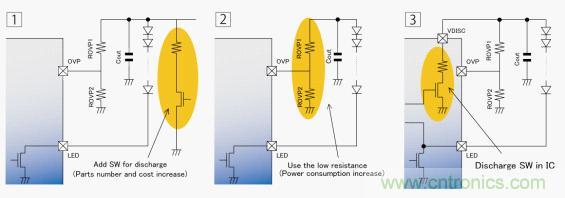 當(dāng)因向LED驅(qū)動(dòng)器輸入啟動(dòng)OFF信號(hào)以及異常檢測時(shí)的保護(hù)動(dòng)作等而關(guān)斷DC/DC轉(zhuǎn)換器的開關(guān)輸出時(shí),輸出電容里會(huì)有殘存電荷。殘存電荷通過DC/DC轉(zhuǎn)換器輸出電壓反饋用的電阻分壓電路(圖5 ROVP1、ROVP2)進(jìn)行放電。但是,放電時(shí)間達(dá)數(shù)秒之長,因此,必須考慮到在這種電荷殘留狀態(tài)下再啟動(dòng)的情況。在這種情況下,殘留電荷通過LED元件進(jìn)行放電,之后進(jìn)行正常的啟動(dòng)控制。這種瞬間放電表現(xiàn)為LED的閃爍。