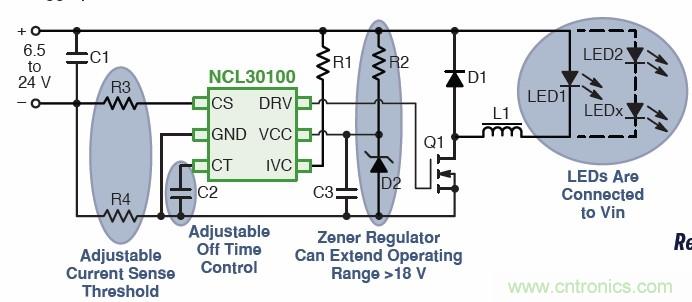 針對空間及高能效要求的低功率應(yīng)用,安森美半導(dǎo)體提供一款能效高達(dá)95%,又具有自然LED開路保護(hù)的固定關(guān)閉時間降壓LED驅(qū)動器控制器NCL30100。該器件采用準(zhǔn)固定關(guān)閉時間、峰值電流遲滯控制方法,不要求補(bǔ)償元件;其低邊N-FET開關(guān)拓?fù)溥m合連續(xù)導(dǎo)電模式工作,無須輸出電容;其工作頻率小于500 kHz,±5%典型穩(wěn)流容限,VCC工作電壓范圍為6.35至18 V。